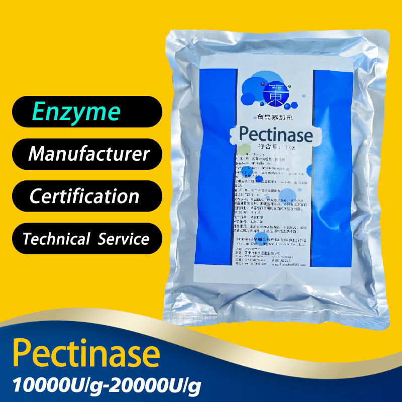 Pektinase wird durch Fermentation von Aspergillus niger gewonnen. Unter geeigneten Temperatur- und pH-Bedingungen kann es Pektin abbauen, Pflanzenzellwände und Interzellularschichten aufbrechen und Pektinmoleküle in kleinere Einheiten oder wasserlösliche Oligomere zerlegen, wodurch die Löslichkeit von Pektin erhöht und die Konzentration und Viskosität von Fruchtsaft und Püree verbessert wird. Steigert die Ausbeute und Stabilität von Fruchtsaft sowie verbessert den Geschmack und die Qualität der Frucht. Verbessert die Saftausbeute und -klarheit. Hauptsächlich verwendet in Industrien wie Frucht- und Gemüsesäften, Lebensmittelverarbeitung, Pflanzenextraktion, Fruchtwein usw. |